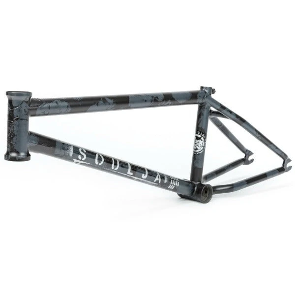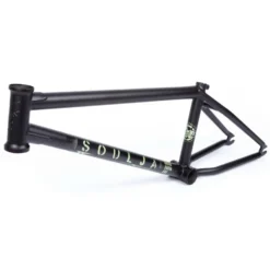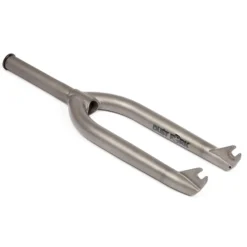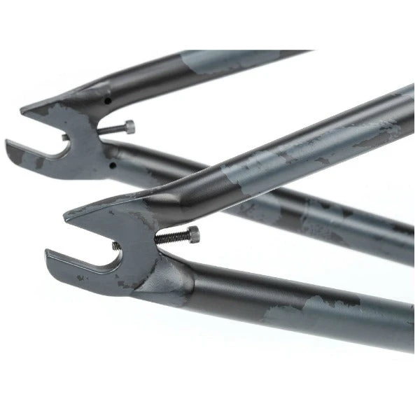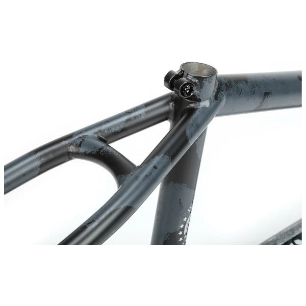 Butted tubing and external gussets at toptube/headtube and downtube/headtube junctions. Featuring an integrated headtube, integrated seat clamp, and 7mm thick invest cast 14mm dropouts with built-in chain tensioners.