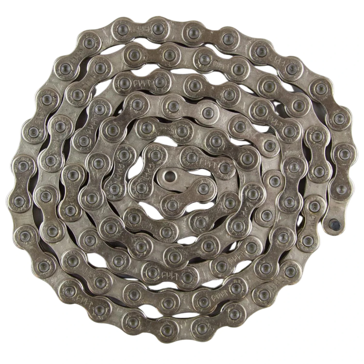 510 chain with stamped Cult logos. Thick side plates and heat-treated and riveted pins for increased strength. Factory-installed half link that can either be used or not used depending on your rear end length. Includes 100 links. MASTER LINK NOT INCLUDED.