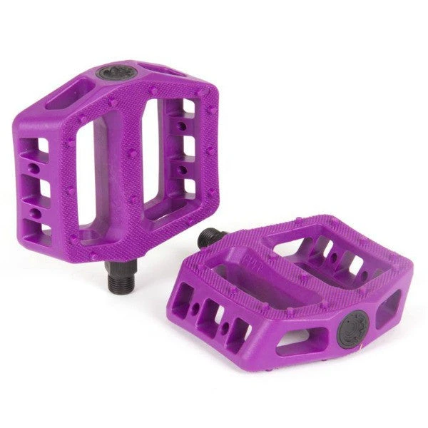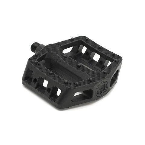 Concave knurled bodies molded from a durable nylon composite. 14 molded pins per side. Chromoly spindle. Unsealed bearings. Sold in pairs. 9/16″.