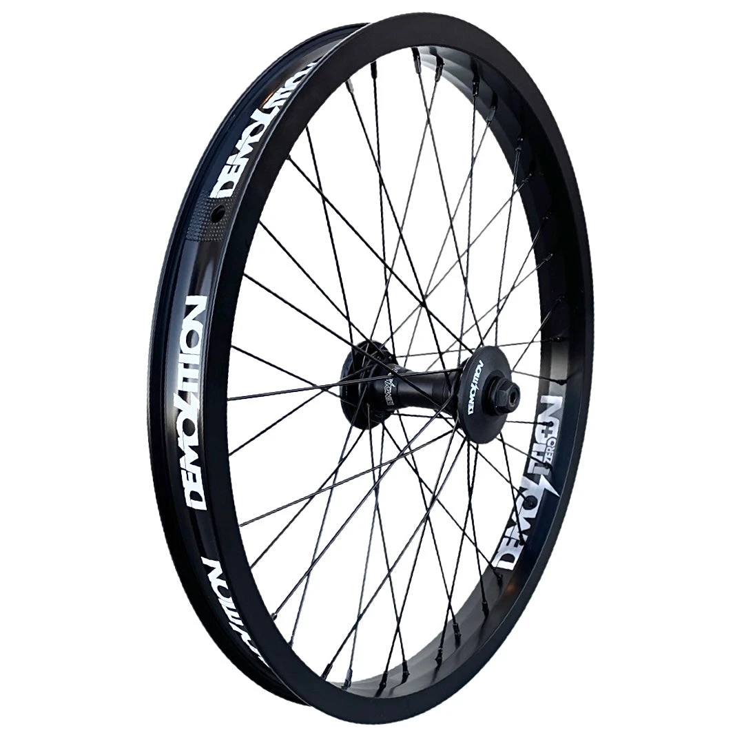 Demolition’s Whistler Pro front hub and beefy new Zero Plus double wall rim (welded seam, 40mm wide) laced with 14 gauge spokes and brass nipples. Includes 2 nylon hub guards.