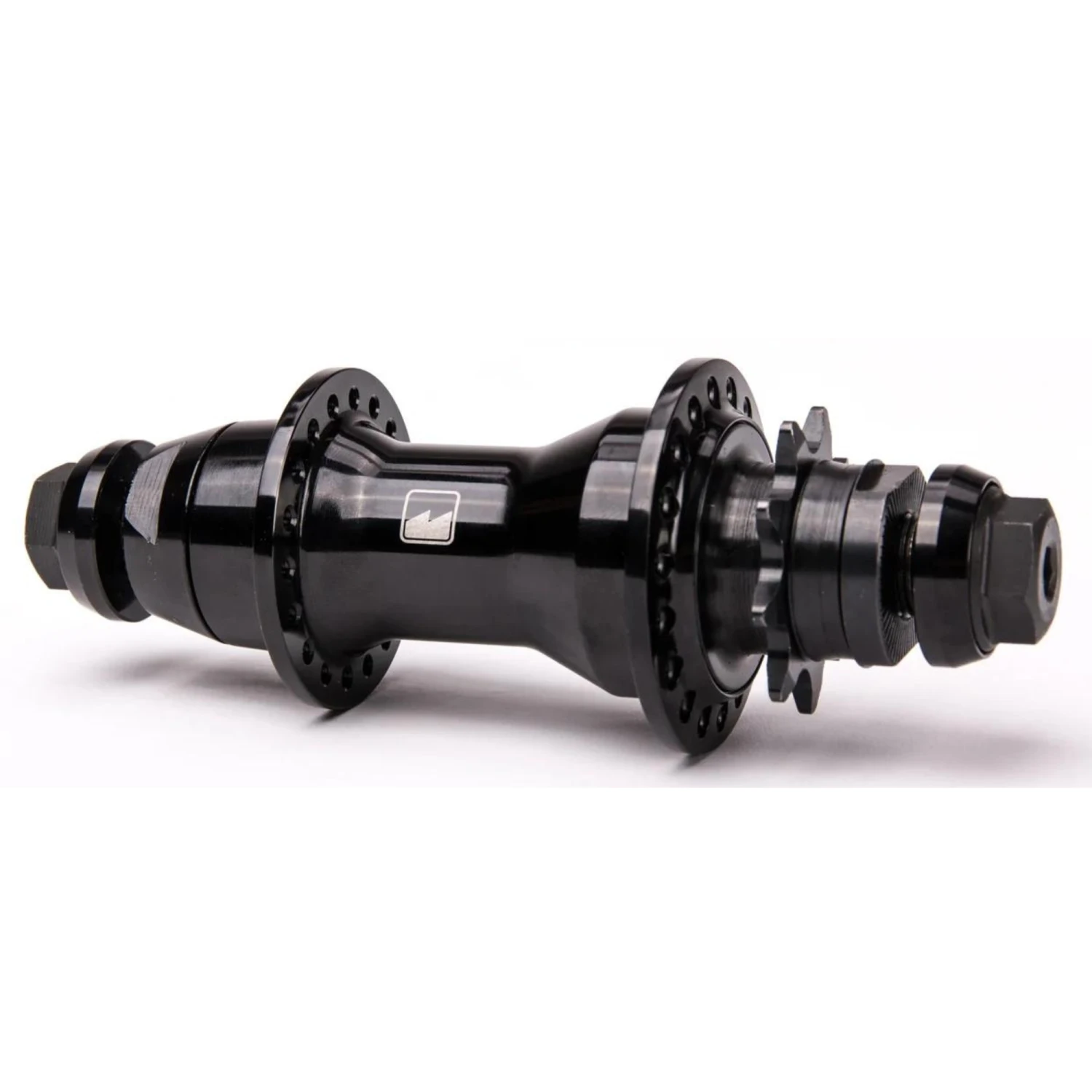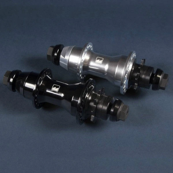 CNC machined 6061-T6 aluminum hub shell with 2 precision-sealed 6902 Japaese bearings. Flanges are angled for increased spoke support. 1-piece chromoly driver with ceramic bushing instead of bearings for increased reliability. 3-pawl multi-spline engagement system allows for 120 points of contact, providing near-instant engagement. 14mm hollow chromoly female center axle with 3/8″ chromoly axle bolts. Steel drive side and alloy non-drive side threaded hardware. 36 hole.