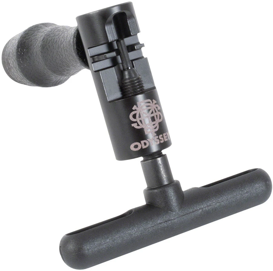 Larger, completely re-designed chain tool. Oversized, ergonomic handle with hidden compartment. Works with most regular and half link chains.