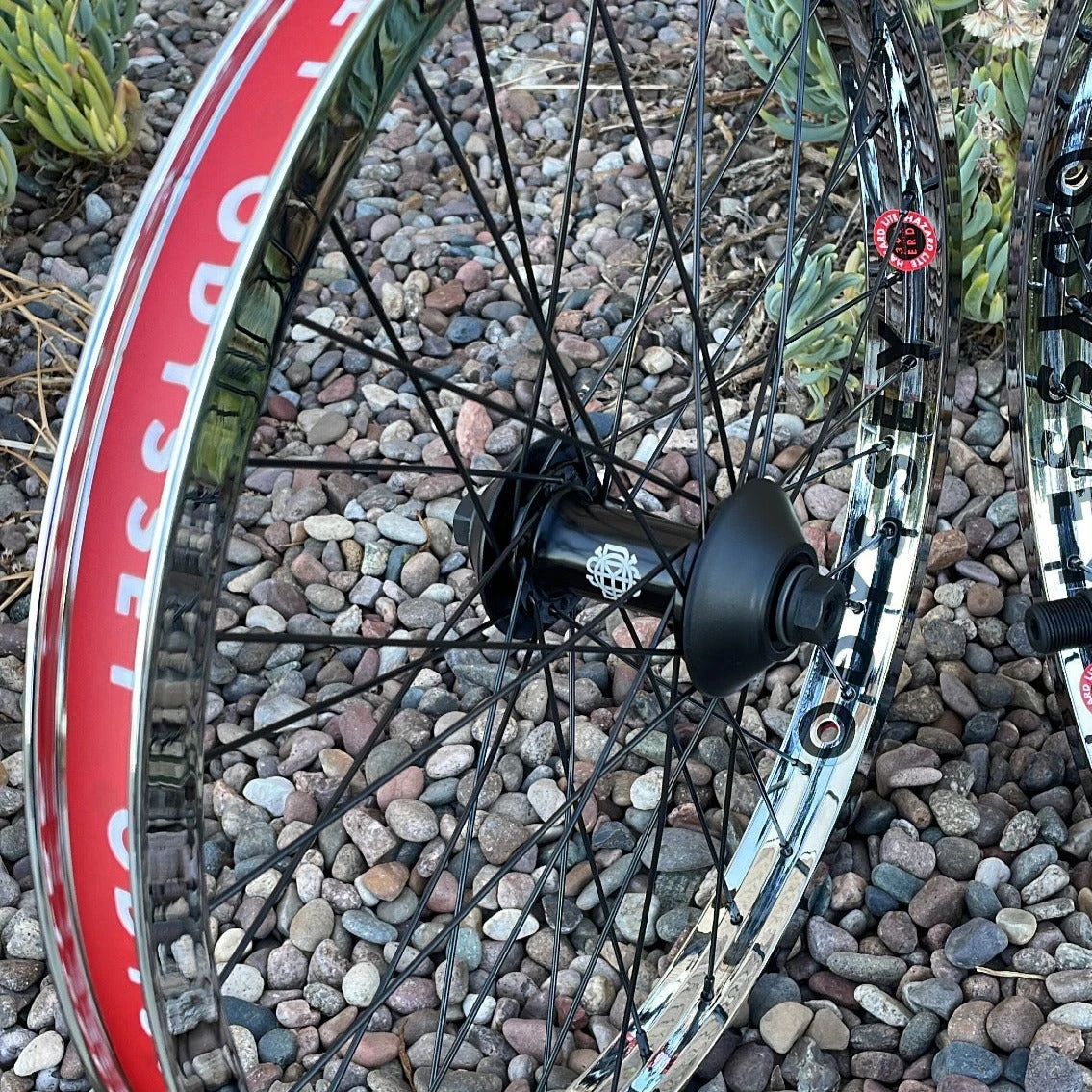 Odyssey’s C5 front hub and Hazard Lite double wall rim laced with 14 gauge spokes and brass nipples.