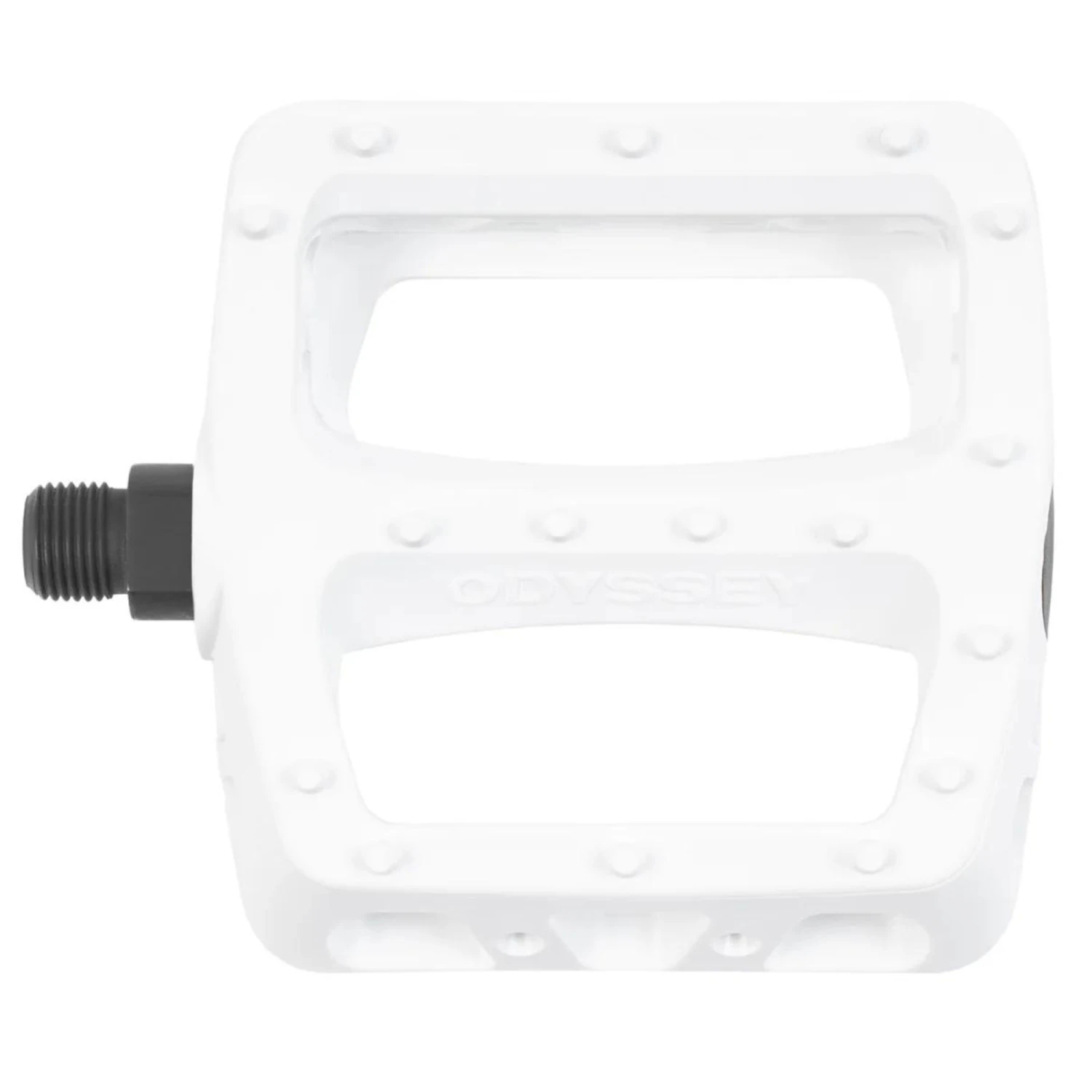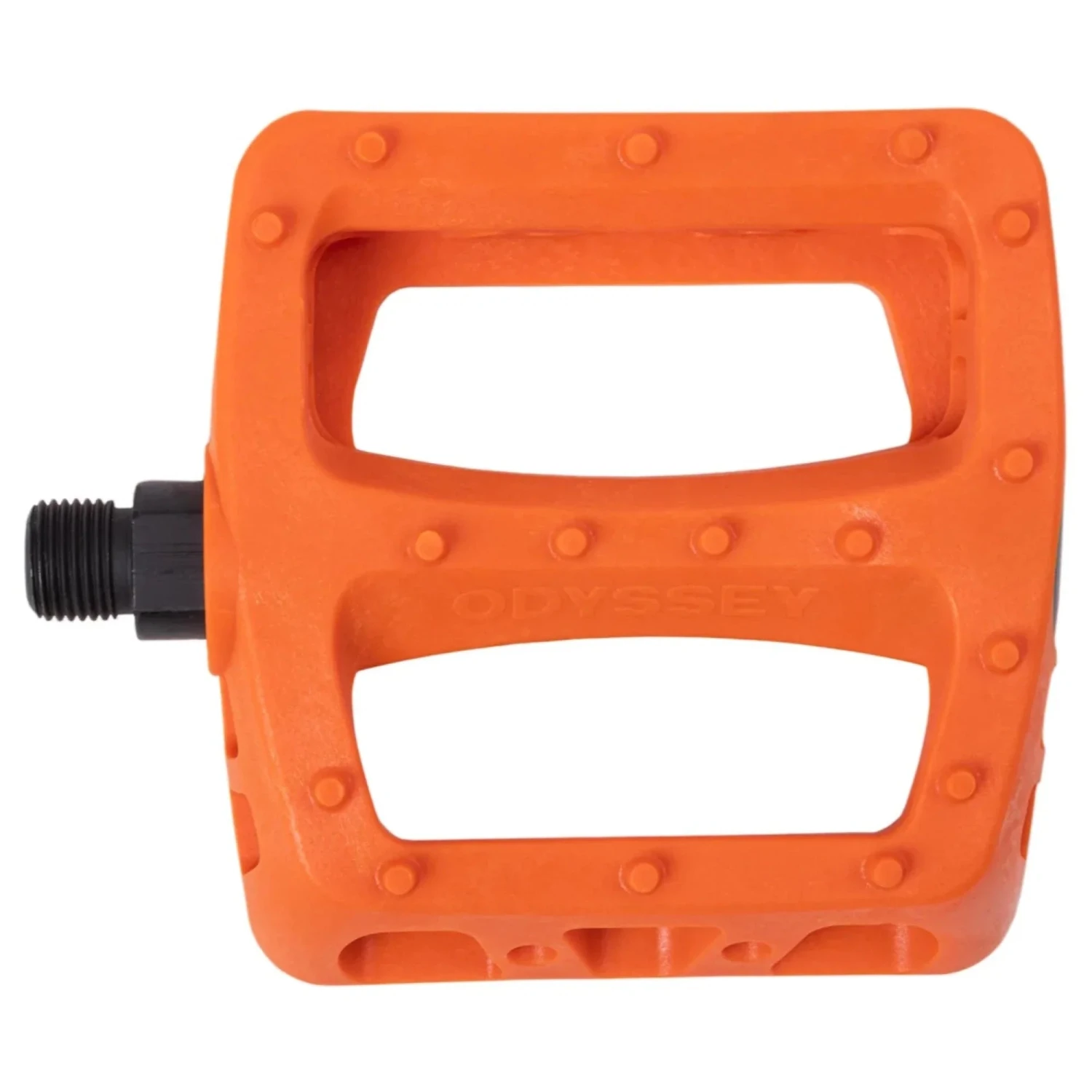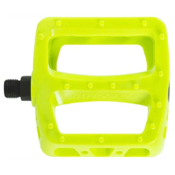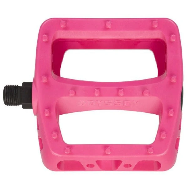 Plastic pedal. Durable plastic composite body with 16 molded pins per side. Unsealed bearings. Chromoly spindles. Sold in pairs.