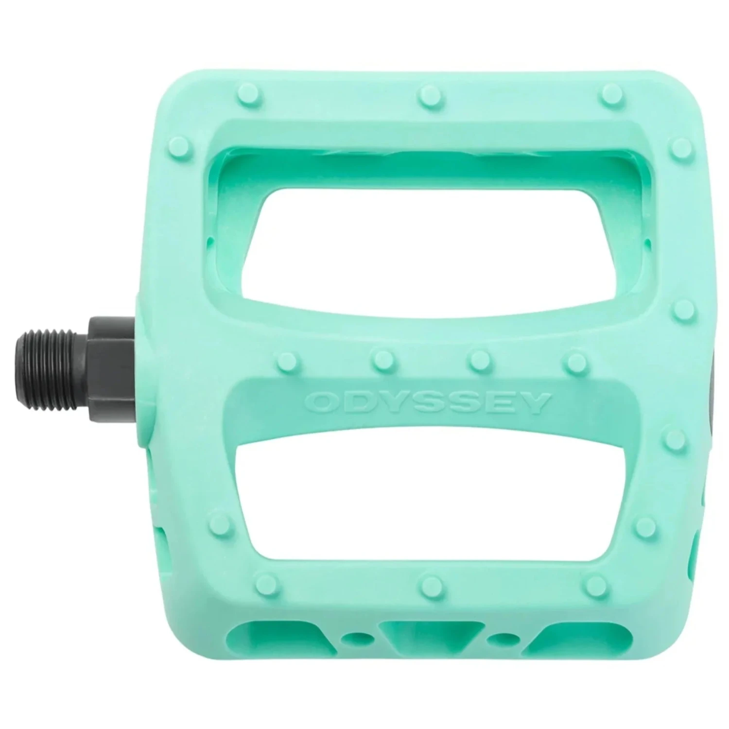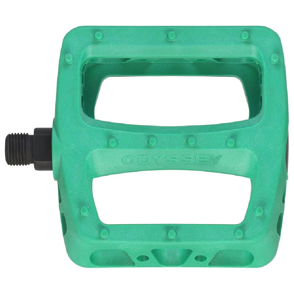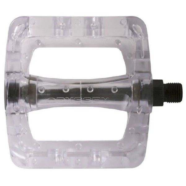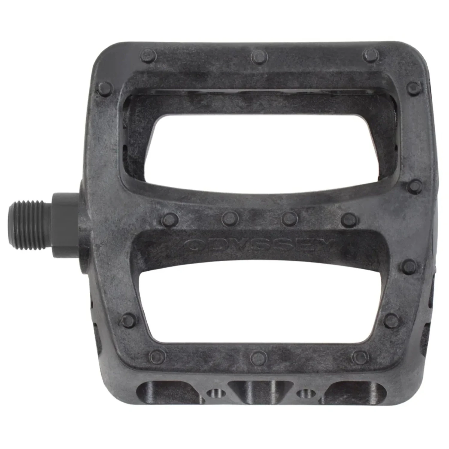 Plastic pedal. Durable plastic composite body with 16 molded pins per side. Unsealed bearings. Chromoly spindles. Sold in pairs.