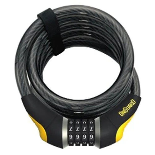 Heavy-duty re-settable combination locking mechanism permanently forged to a 6ft long self-coiling cable. Includes quick-release mounting bracket.