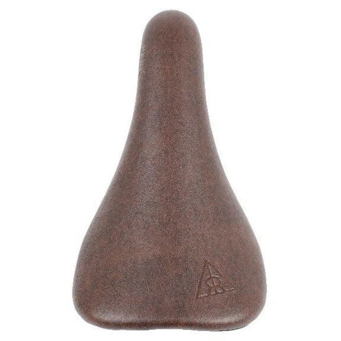 Slim railed seat with 1-piece faux leather cover and embossed Relic logo.
